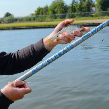 Deze oversteek whips met dunne diameter zijn ontworpen voor het vissen met lange lijnen uit de hand op witvis.De snelle actie van de blank zorgt ervoor dat zelfs lichte dobbers moeiteloos kunnen worden ingeworpen bij gebruik van een lange lijn. De meegeleverde, snel taps toelopende carbon flick-tip is ook geschikt voor het ligten van grotere vissen. Indien gewenst kan de tip worden verwijderd om de hengeltop van elastiek te voorzien. De Accelerate Pro Whip heeft versterkingen aan de onderkant van elke deel.