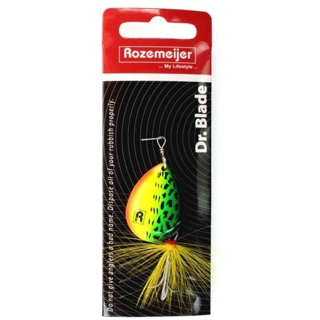 Spinners, wie is er niet mee begonnen in de polder of in zijn lokale visvijver? Spinners zijn nog steeds helemaal hot en vangen absurd veel roofvis, van baars tot snoekbaars en van snoek tot roofblei. Wij van Rozemeijer weten dat als geen ander en hebben nu deze serie spinners ontwikkeld; Dr Blade! Te verkrijgen in verschillende maten blad (#3 – #4 – #5) en in 3 schitterende kleuren: Speckled Fire Tiger (SFT) / Speckled Red Head (SRH) / Speckled Hot Pike (SHP).