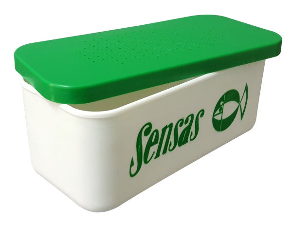 De witte doos (56775) heeft een geperforeerde deksel voor levend aas zoals maden en wormen.